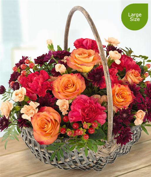 Orange Roses married with orange and cerise Carnations and deep burgundy Spray Chrysanthemums with a generous dash of pretty Hypericum Berries. A simply stunning autumnal flower basket.