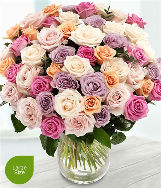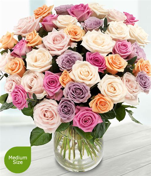A simply magnificent bouquet, bursting with Roses in mixed soft shades.