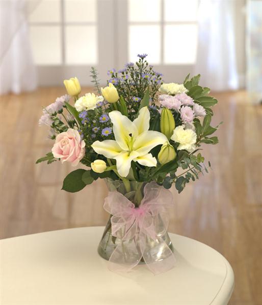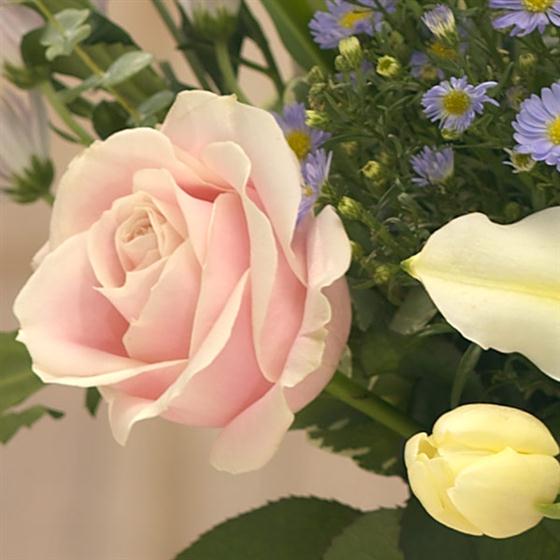 Pink Roses and white Lilies are the star attraction of this bouquet of pastel flowers delivered in a vase.