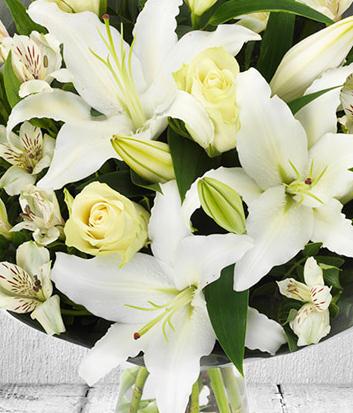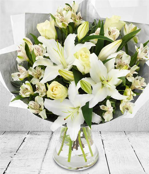Wish for a white Christmas with this stunning bouquet of white roses, white lilies and white alstroemeria.