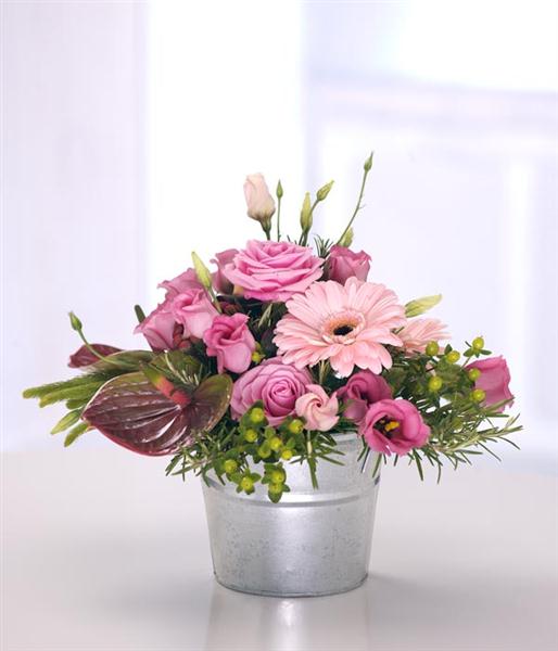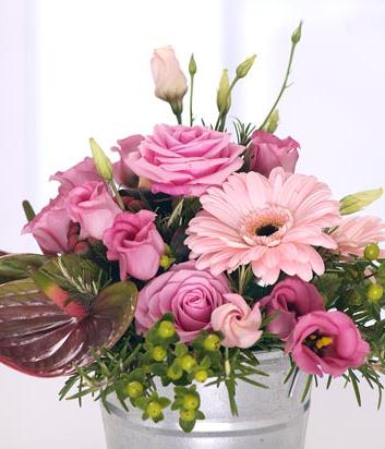 A lovely round modern container arrangement featuring mixed pink flowers including Roses, Gerbera, Anthurium and Lisianthus. Flowers are arranged in floral foam for long lasting freshness and easy display.