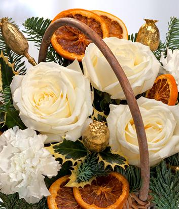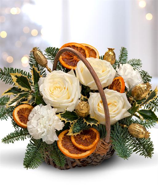 A stunning Christmas flower basket arrangement. White Roses and Carnations with a touch of Holly and Blue Spruce. Gold dried Papaver and sprinkling of dried orange slices completes this gorgeous gift.