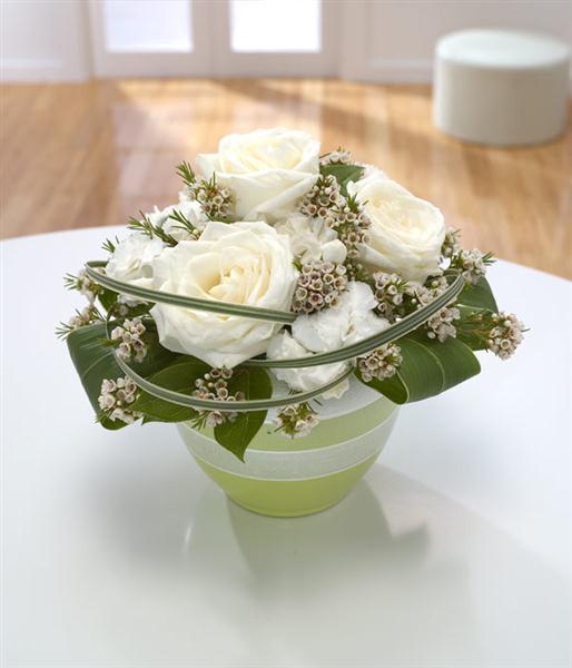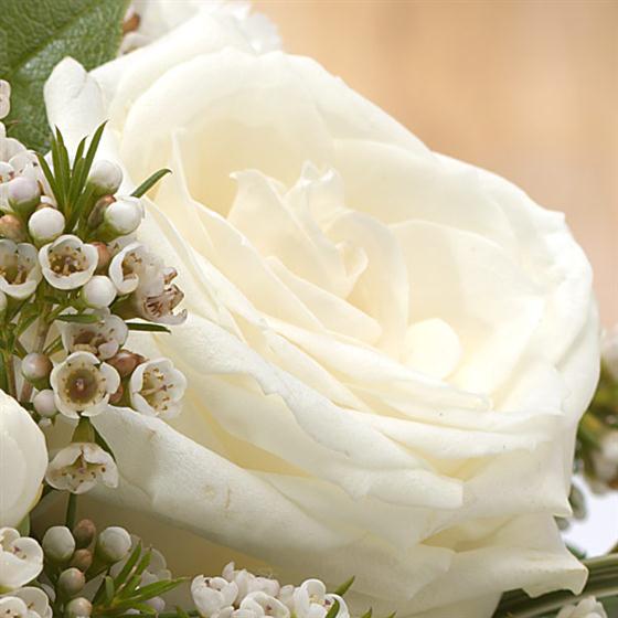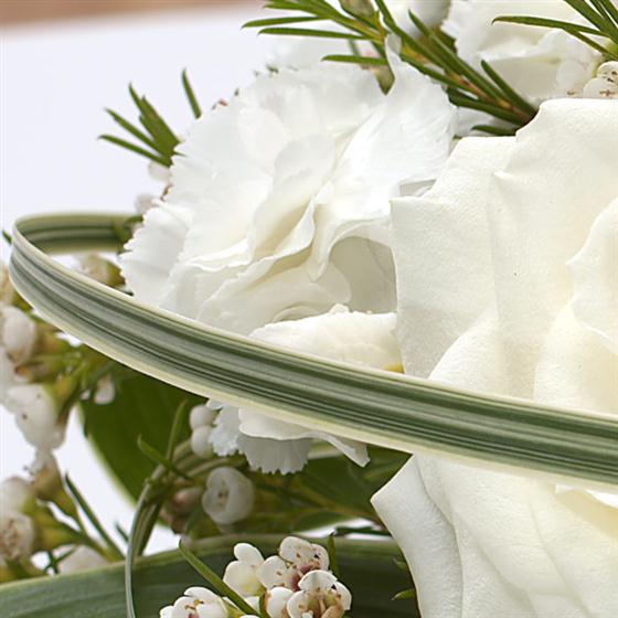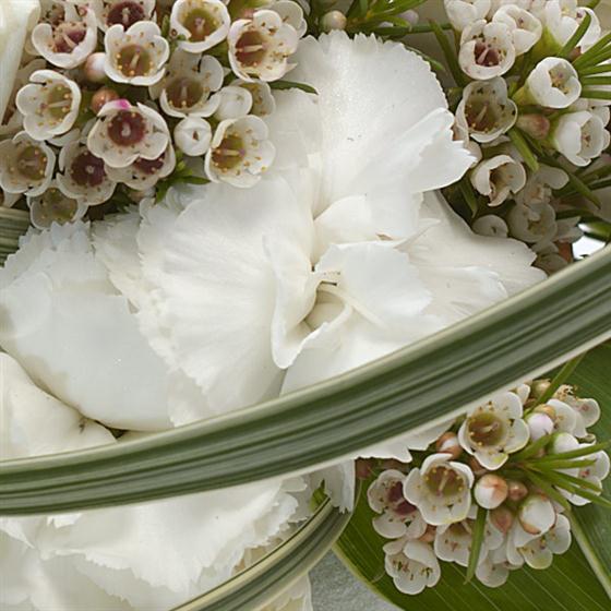 Circled with love and loops of grass, these white Roses, Carnations and Wax flowers look serene.