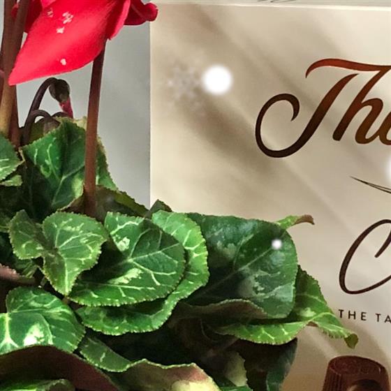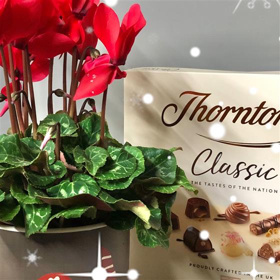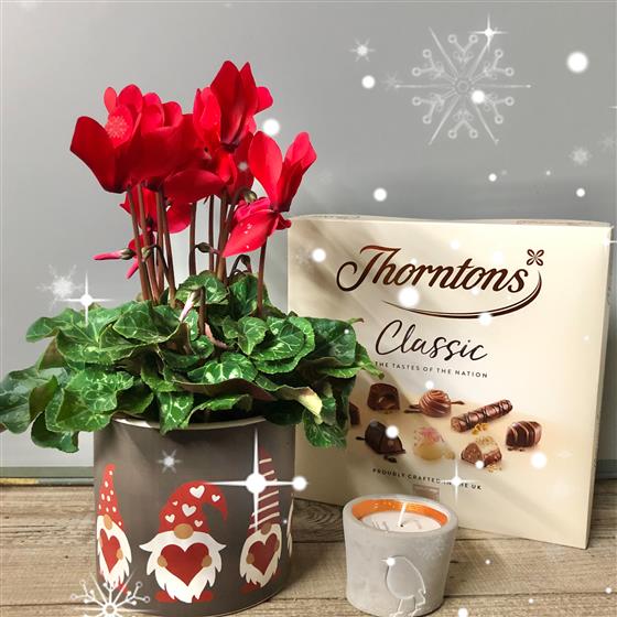 Treat someone to this lovely collection of gifts. Red cyclamen in a festive gonk pot, a delicious box of Thornton chocolates and the beautiful Christmas scent of an orange and cinnamon candle in a reusable Robin pot.