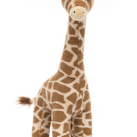 A lofty mascot for any nursery, Dara Giraffe stands tall and proud! Scrumptiously soft in mottled banoffee fur, with cocoa horns, weighted hooves, a silky mane, and tufty tail. With such a welcoming smile, Dara makes playtime a fun safari!