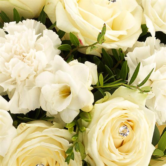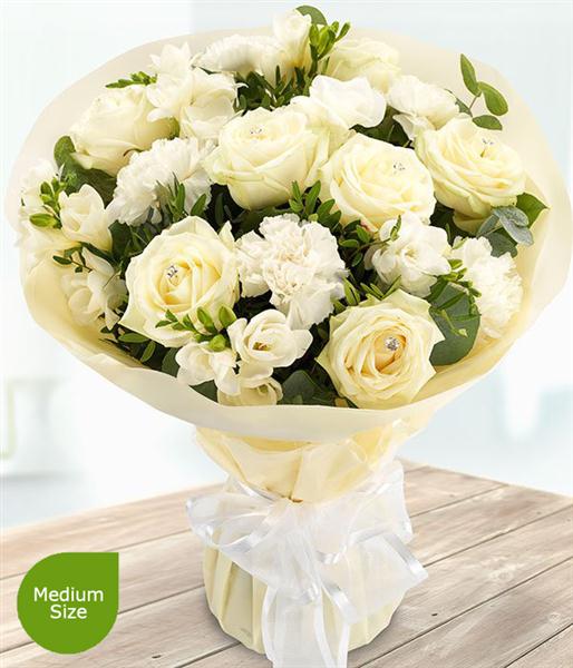 Includes White Roses, White Freesias, White Carnations, Eucalyptus and Pistache.