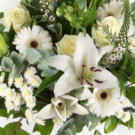 An elegant hand-tied bouquet of white lilies, roses, mini gerberas, chrysanthemums and flowing foliage.