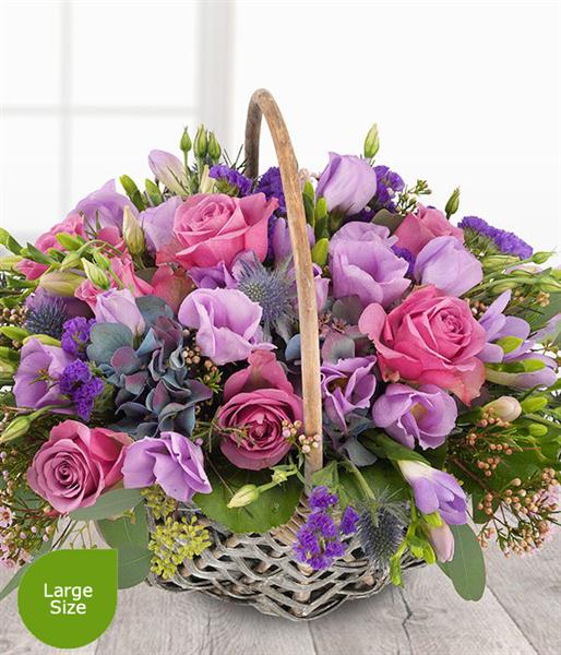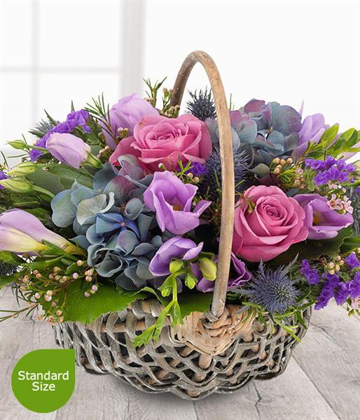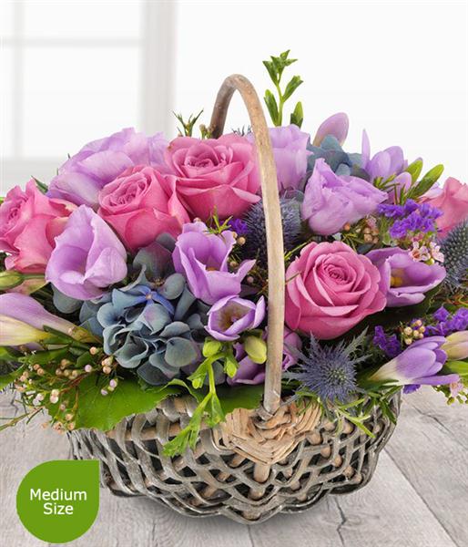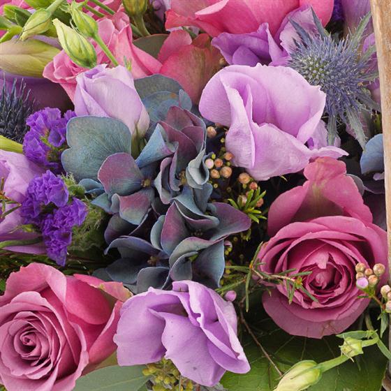 Includes Blue Hydrangeas, Pink Roses, Lilac Lisianthus, Purple Statice, Lilac Freesias, Pink Wax Flower, Eryngium, Eucalyptus, Rosemary, Galax Leaf.