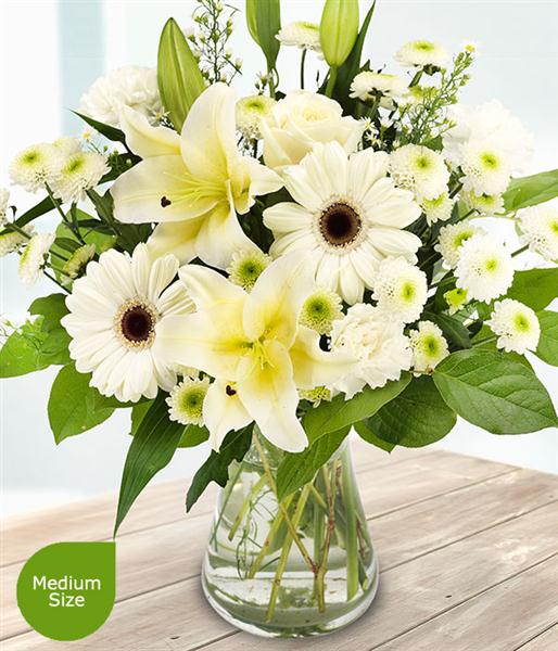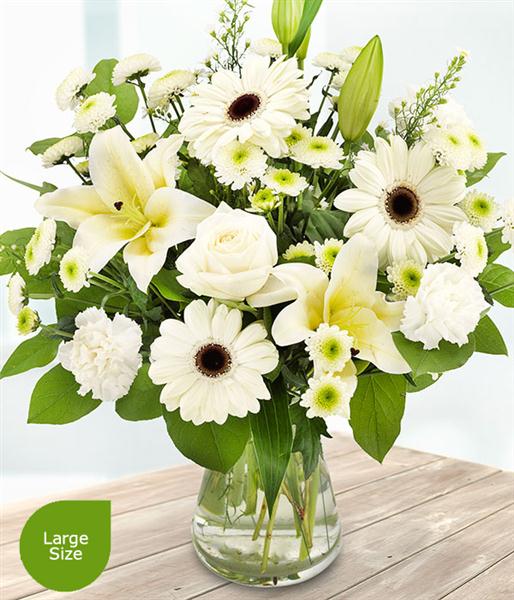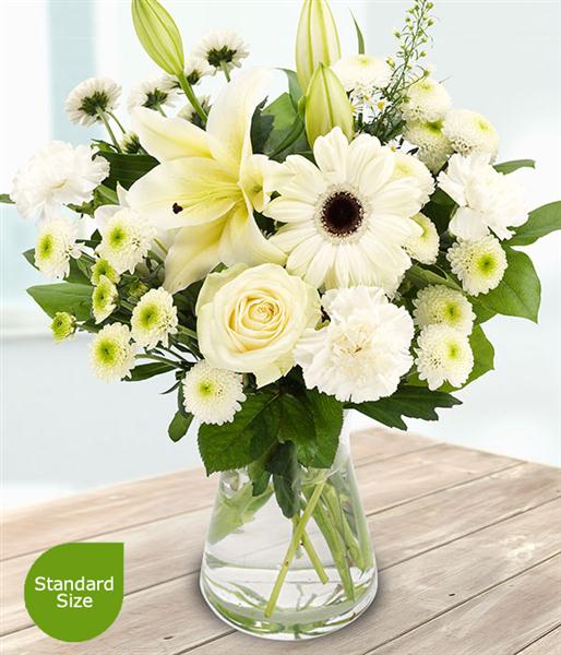 Pure white Roses, Lilies, Gerberas, Asters, Carnations and Spray Chrysanthemums have been brought together to create this simple yet stunning bouquet.