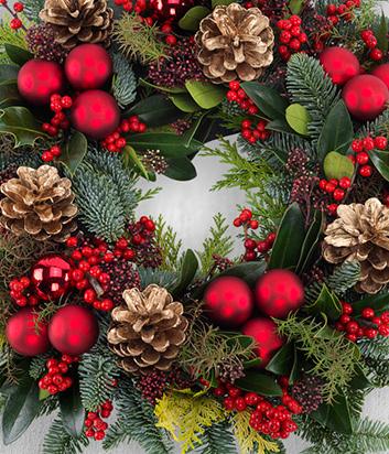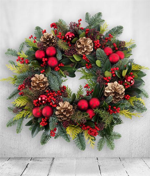 The perfect welcome home this Christmas. A stunning ruby red Christmas fresh flower wreath made with pine, cupressus, ilex berries and other mixed foliage.
