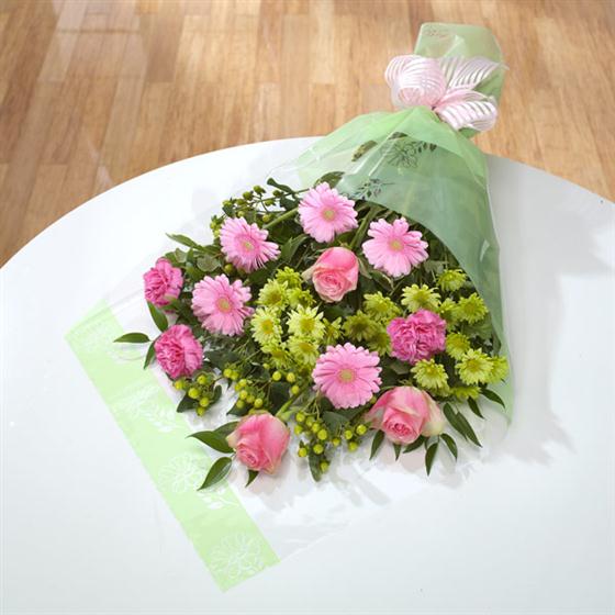 A classic bouquet of pink Roses, Germini and spray Chrysanthemums.