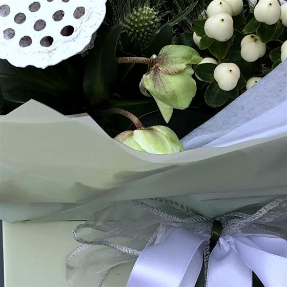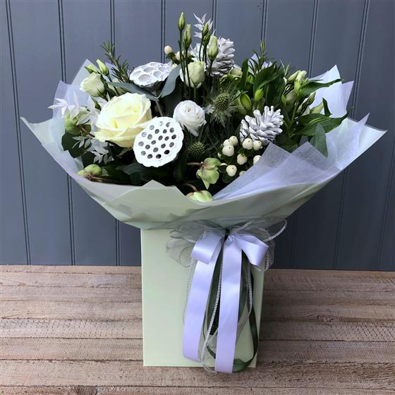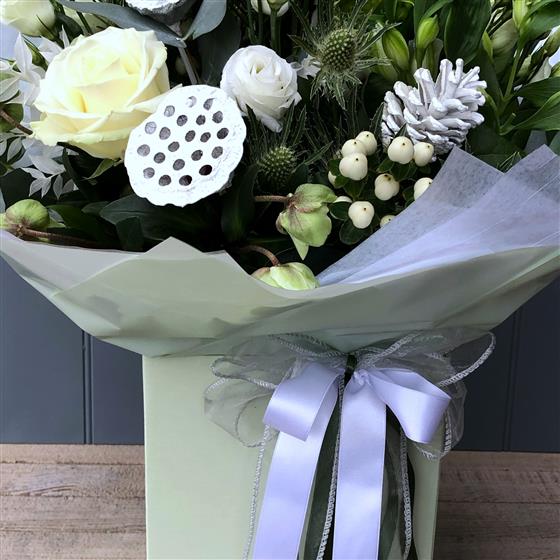 Ice white Roses, Carnations and Chrysanthemum are exquisitely combined with dried silver Poppies and Lotus seed heads. A stunning Christmas gift box Bouquet.