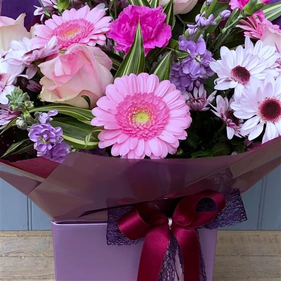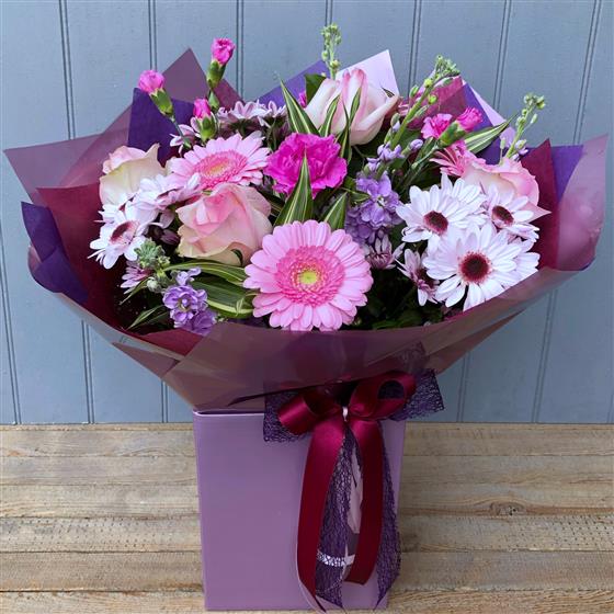 A lovely aqua pack hand tied bouquet in subtle shades of pink & white, beautifully packaged in complimentary colours.
