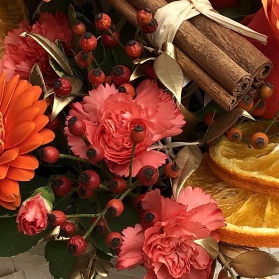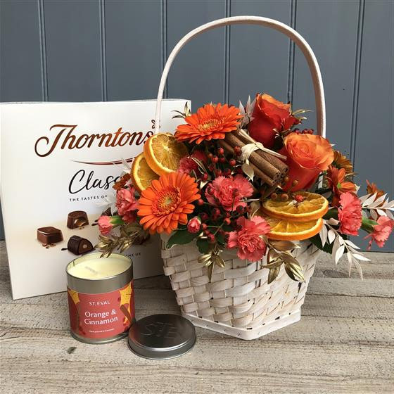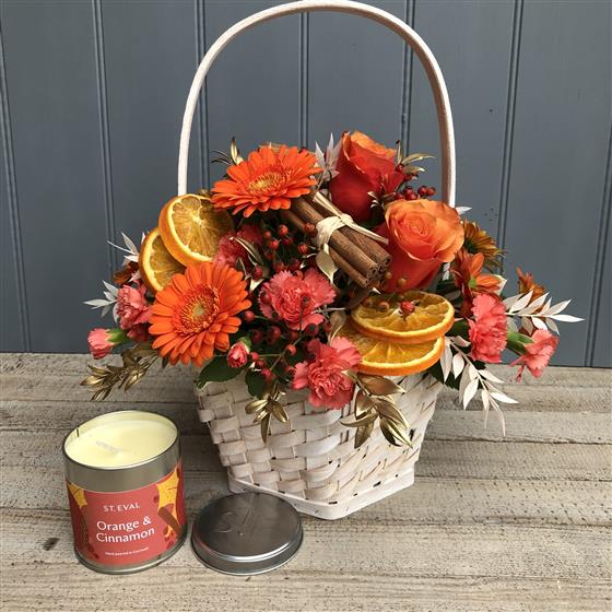 This delightful basket in rich orange and cream including Orange slices and cinnamon sticks. Sure to brighten someone's day!