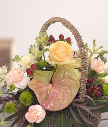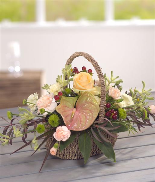 A delicate flower basket colour combination of peaches and cream. Roses, Chrysanthemums and Carnations are the order of the day accompanied by Hypericum berries, intertwined with Rosemary.