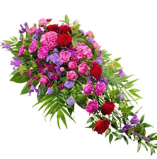 Classic single ended spray in summer shades of pink and red including Roses and carnations