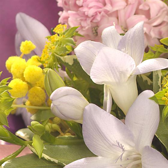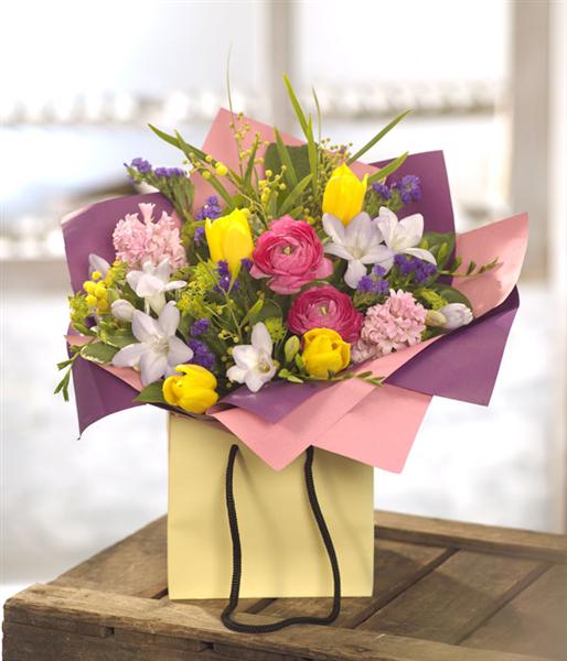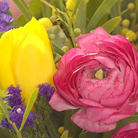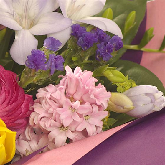 An explosion of colour in this fragrant posy: fragrant Freesia, Hyacinth and Mimosa enhanced with Ranunculus, Tulips and Statice.