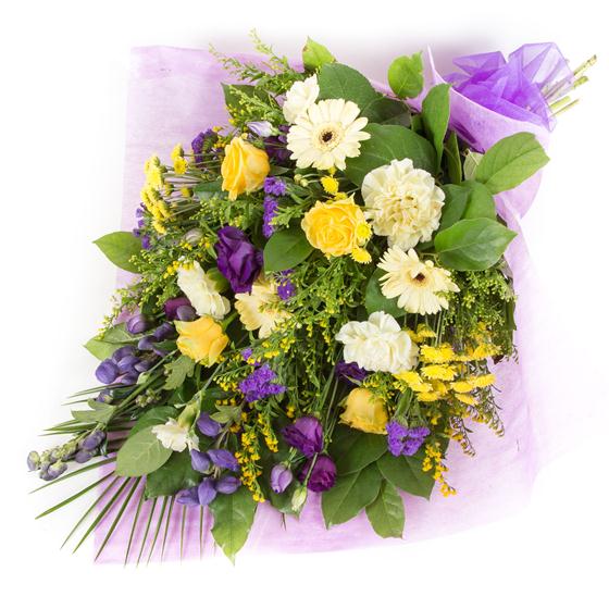 A traditional style bouquet of golds and purples including roses, lisianthus, mini gerberas and solidaster.