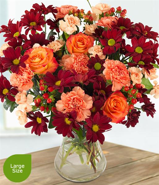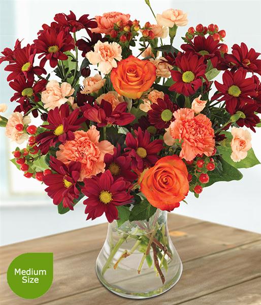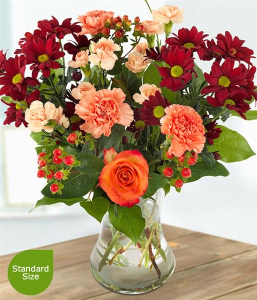 Bring home a hint of autumn with this glorious hand-tied flower bouquet. Orange Roses, Carnations and Hypericums are perfectly married with red and peach Spray Chrysanthemums.