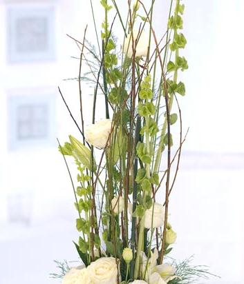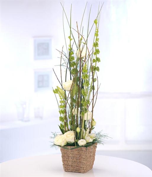 A striking tall modern arrangement featuring white Lilies, Roses and Lisianthus intertwined with Willow twigs and contrasting foliage. Flowers are arranged in floral foam for long lasting freshness and easy display.