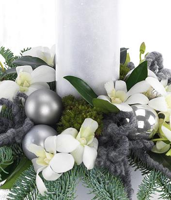Light up someone's day with this simple yet stunning candle arrangement in greys, whites and cream dendrobium, ball moss and nobilis.