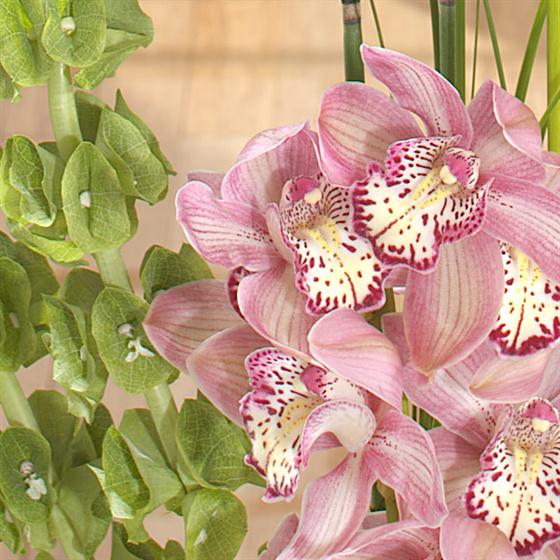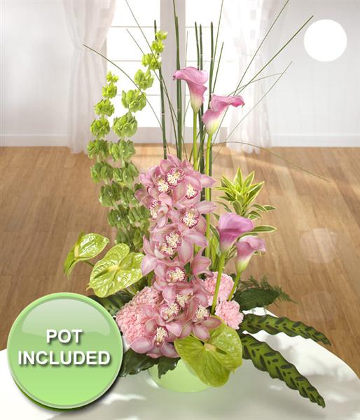 Pink Cymbidium Orchids and Calla Lilies are the heroes of this statement design. Built on a base of frilly pink Carnations and Calathea leaves and accented with green Anthurium.