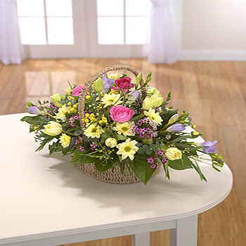 A classic basket arrangement of Spring flowers - lilac Freesia, cream double Tulips, mauve Wax Flower and yellow Mimosa. Absolutely beautiful.