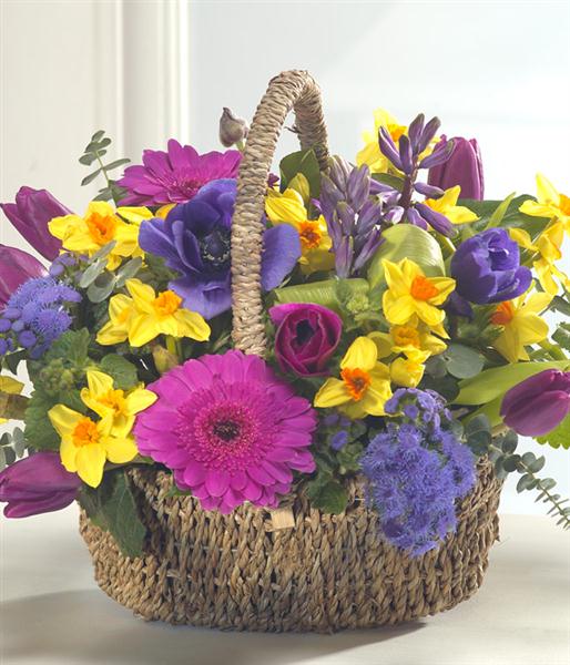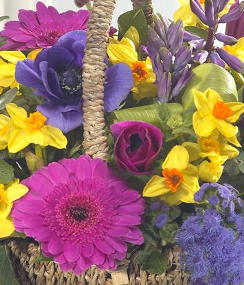 Bold and beautiful, this flower basket is a must have this spring. Fabulously fragrant purple Hyacinth zing alongside cerise Germini, purple Anemone and Tulips. Yellow Paperwhite Narcissi add that all important touch of sun.
