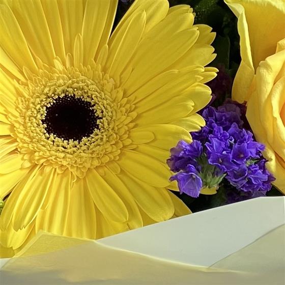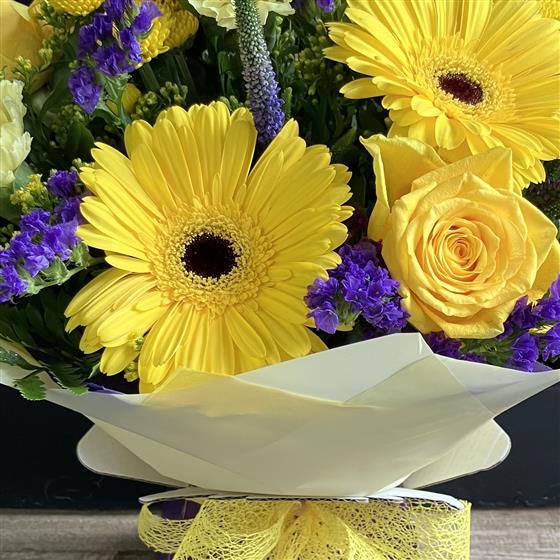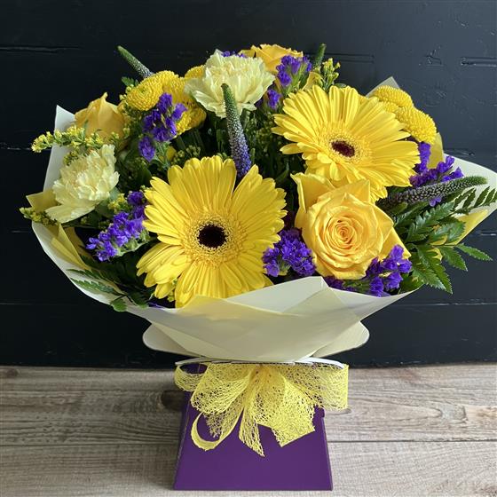 Shades of yellow Roses, Gerbera and Carnations mingle with purple Veronica and Statice for a bold effect in this luscious aqua pack.