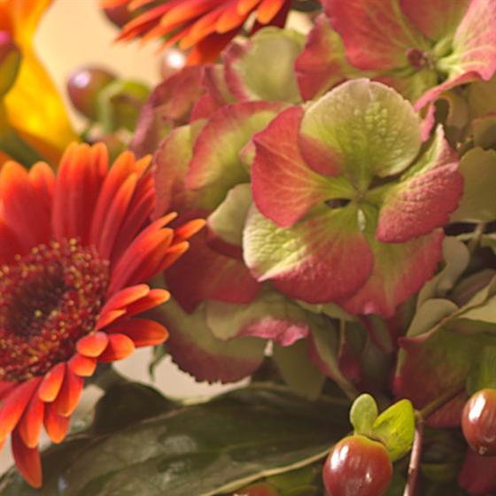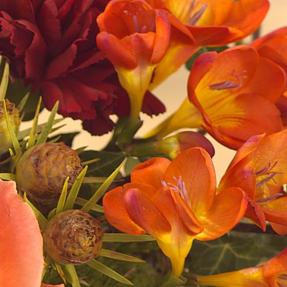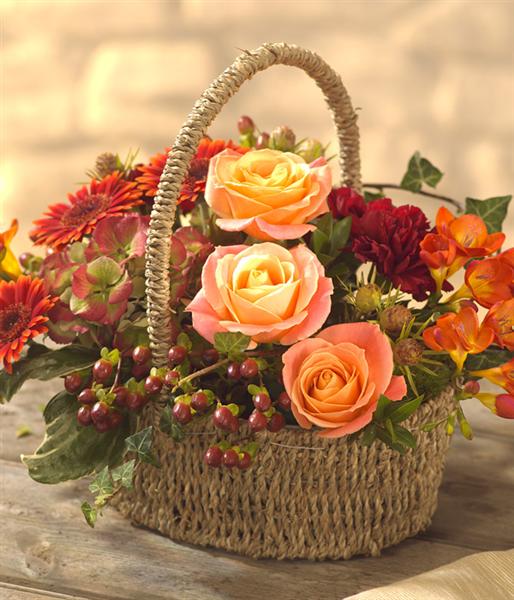 A simply gorgeous autumnal flower basket arrangement in rich reds and rustic oranges. Roses, Hydrangea, Freesia, Germini, Carnations and Hypericum berries.