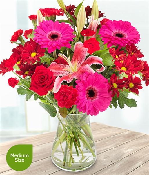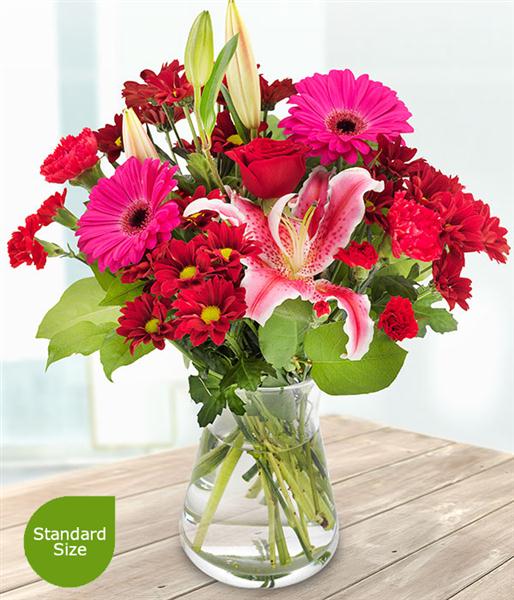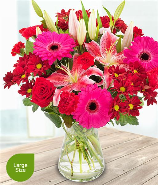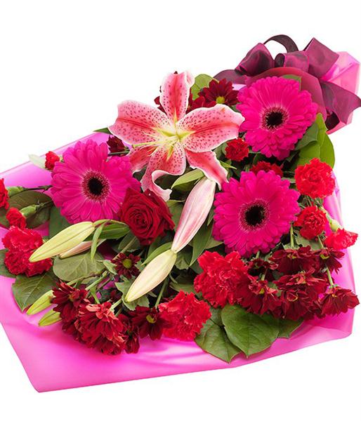 A passionate pink and red flower bouquet. Red Rose and Carnations with pretty pink Lilies, cerise Gerberas and Carnations mixed with burgundy Spray Chrysanthemums.