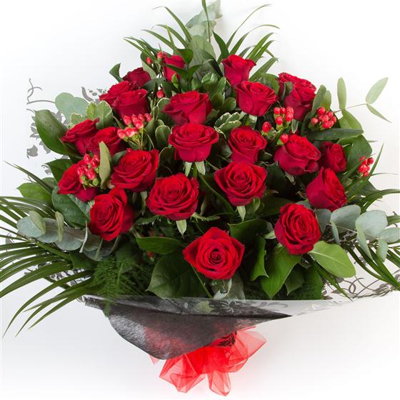 A show stopping bouquet of 24 long stemmed roses, hand-tied and presented in co-ordinating gift wrap. Available in four different colour options, red, pink, white or yellow.