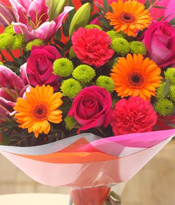 Delight the senses with this fantastically vibrant and fragrant bouquet. Orange Germini, cerise Roses and Carnations have been perfectly married with gorgeous green Santini and Lilies.