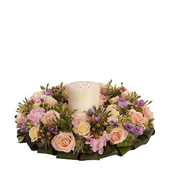 A triple wick church candle encompassed by a pretty pastel wreath. Pink and cream Roses, pink Hydrangea and Hypericum are mixed with purple Lisianthus and white Eryngium.