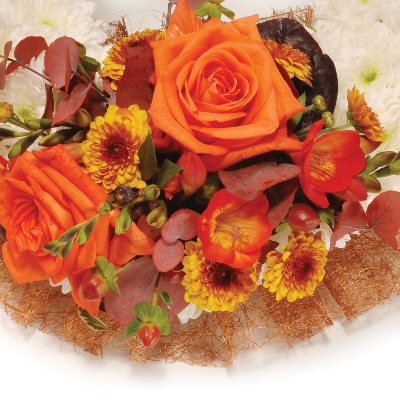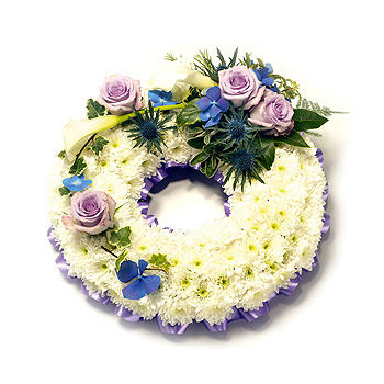 Based white Chrysanthemum round wreath including Roses, Hydrangea and Eryngium with complementary foliage. Size: Diameter - 31cm (12")frame. Medium 36cm (14")frame. Luxury 41cm (16") frame.