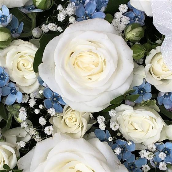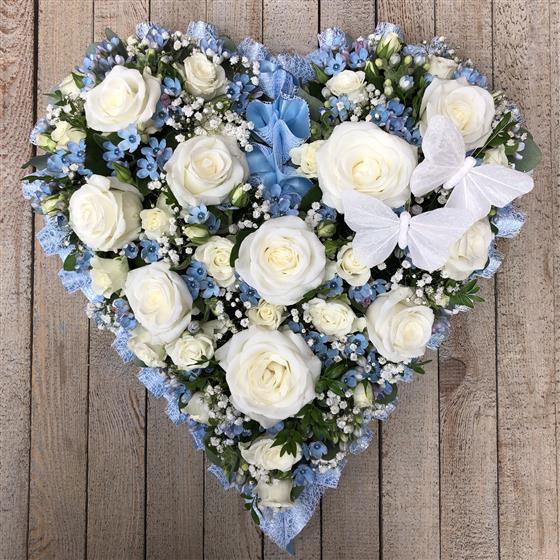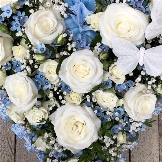 White Roses, blue Oxypetalum and Gypsophila are used to create this dainty heart finished with two butterflies. Heart standard size 15” and large size 17”